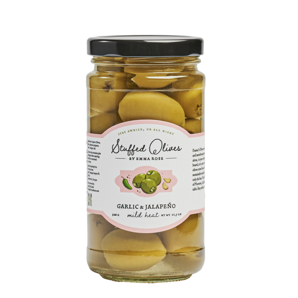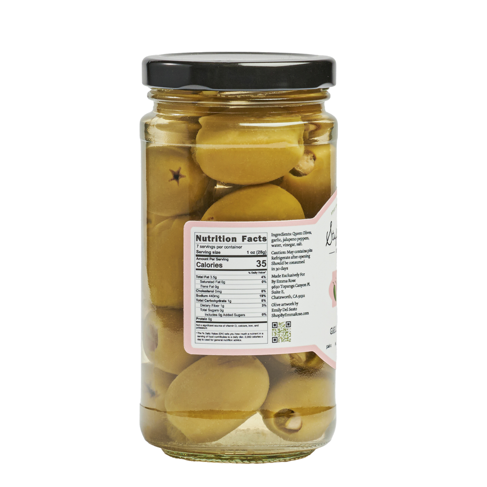 A delicious combination filled with a flavorful blend of garlic and a kick of mild heat from the jalapeño, creating a zesty and satisfying taste. These olives are a delightful addition to salads, appetizers, and various dishes or cocktails.